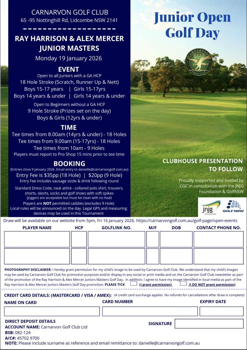 Ray Harrison and Alex Mercer Junior Golf Day on Monday 19 January 2026. This event is open to all Juniors who hold a current GA Handicap, with a tyro event held in conjunction for beginners (under 12 years of age and without a GA Handicap). This event is run in conjunction with the JNJG Foundation.